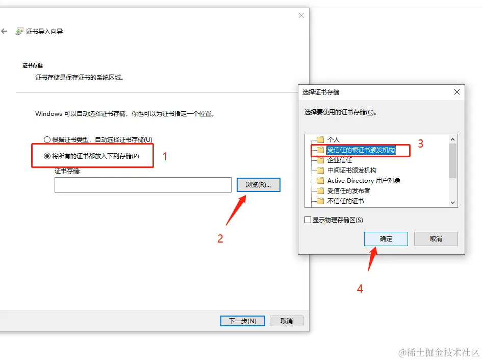 - 本地计算机:证书会对所有登录到该电脑的用户有效。如果你是管理员,并且希望所有用户都能够信任该证书,或者你需要在系统服务中使用该证书,那么应该选择安装到本地计算机。