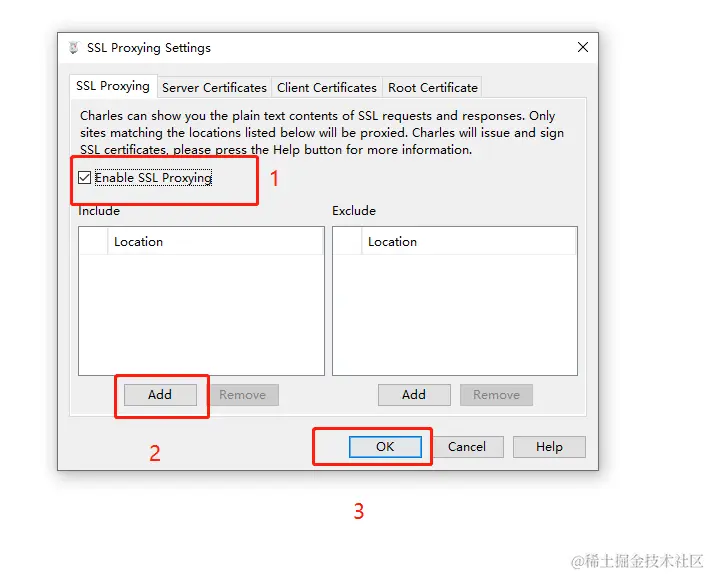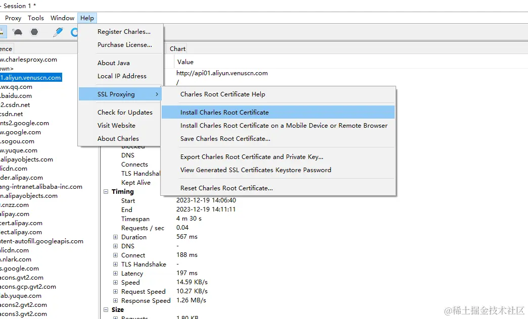默认情况下,charles不能解析https协议的接口,里面的请求和响应数据都是乱码格式,需要下载ssl证书,来获取里面的数据。点击help,按照下图的步骤走就可以。