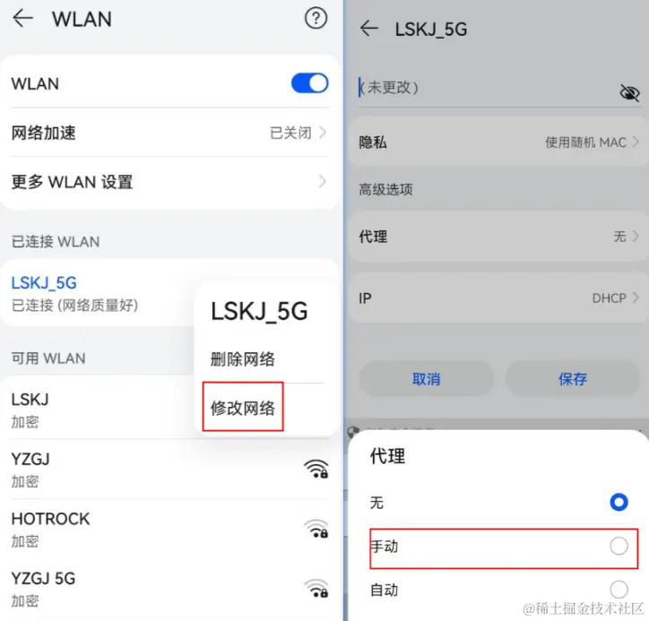点击修改网络,代理选择手动配置
