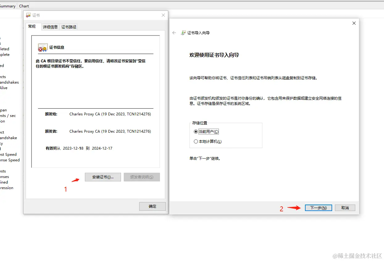 - 当前用户:证书只会对当前登录的用户有效。这意味着只有当前用户登录的会话中的应用程序可以信任该证书。如果你的电脑只有你一个人使用,或者你不希望其他用户受到证书安装的影响,可以选择安装到当前用户。