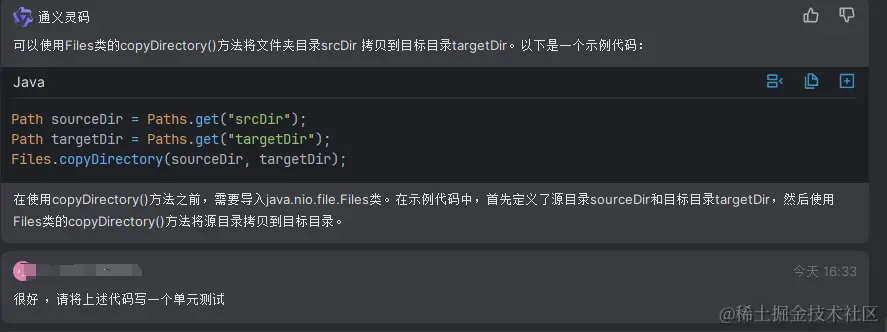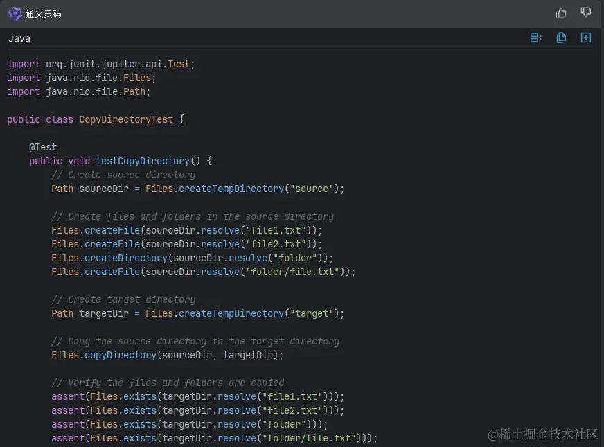 使用某个API忘记了,直接搜索,在使用copyDirectory()方法之前,需要导入java.nio.file.Files类。一会就会生成代码: