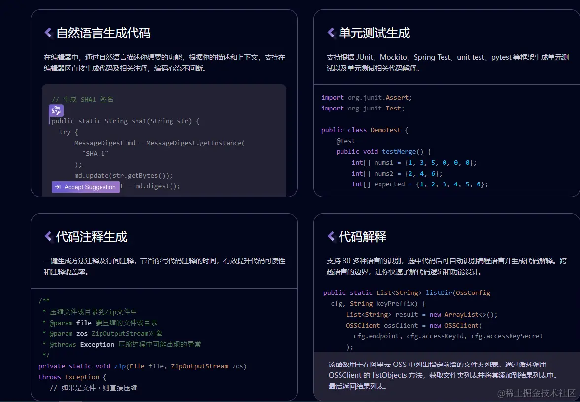 支持编程语言 支持 Java、Python、Go、C#、C/C++、JavaScript、TypeScript、PHP、Ruby、Rust、Scala、Kotlin 等主流编程语言。