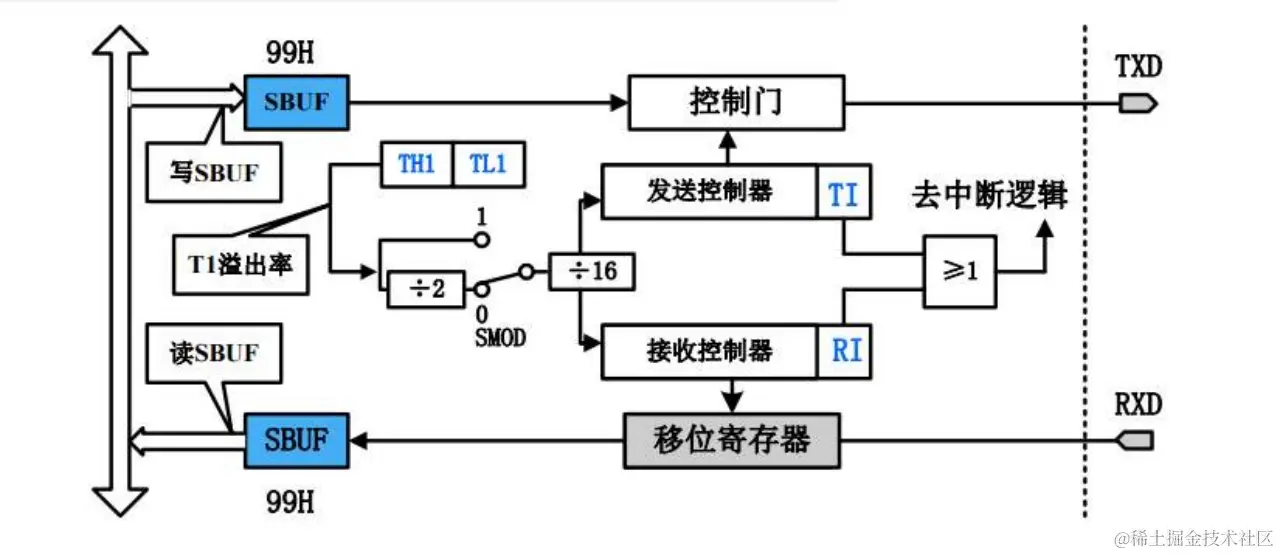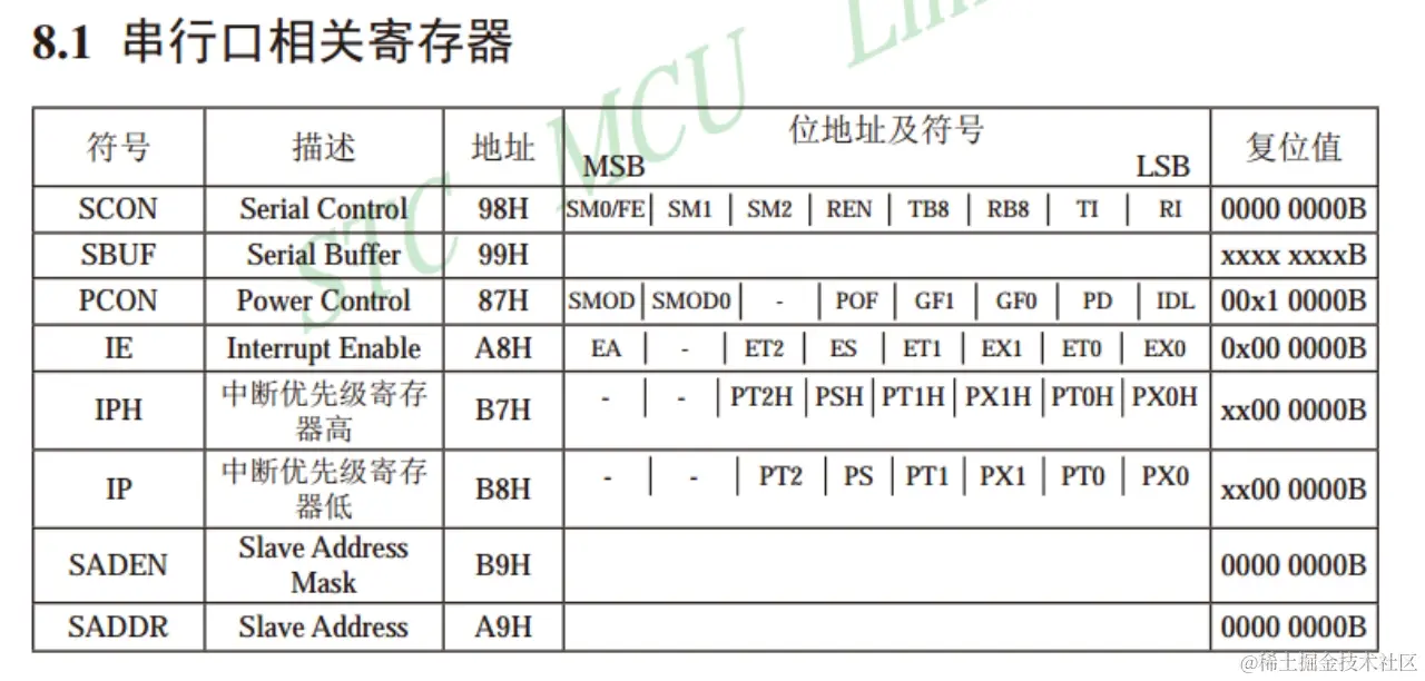 SBUF:串口数据缓存寄存器,物理上是两个独立的寄存器,但占用相同的地址。写操作时,写入的是发送寄存器,读操作时,读出的是接收寄存器