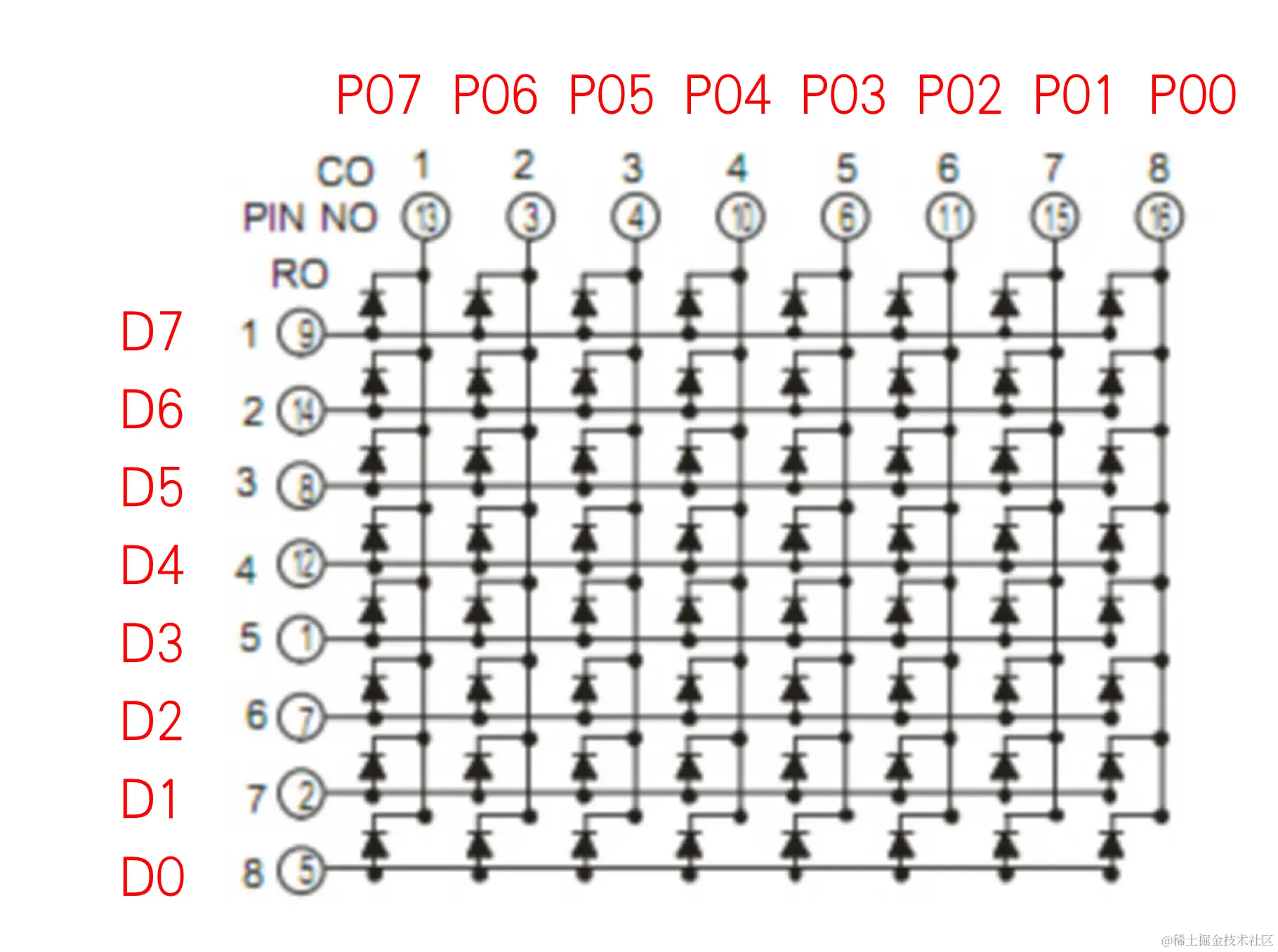 LED点阵屏与数码管一样,有共阴和共阳两种接法,不同的接法对应的电路结构不同