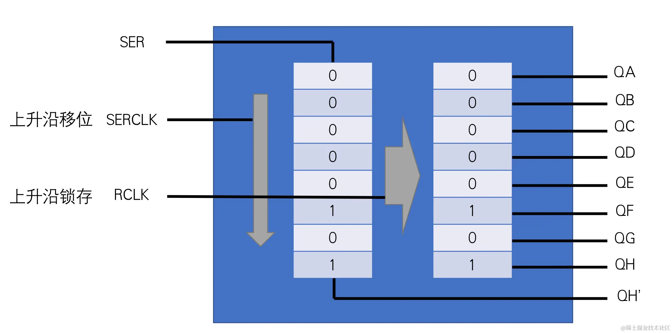 74HC595是串行输入并行输出的移位寄存器,可用3根线输入串行数据,8根线输出并行数据,多片级联后,可输出16位、24位、32位等,常用于IO口扩展。