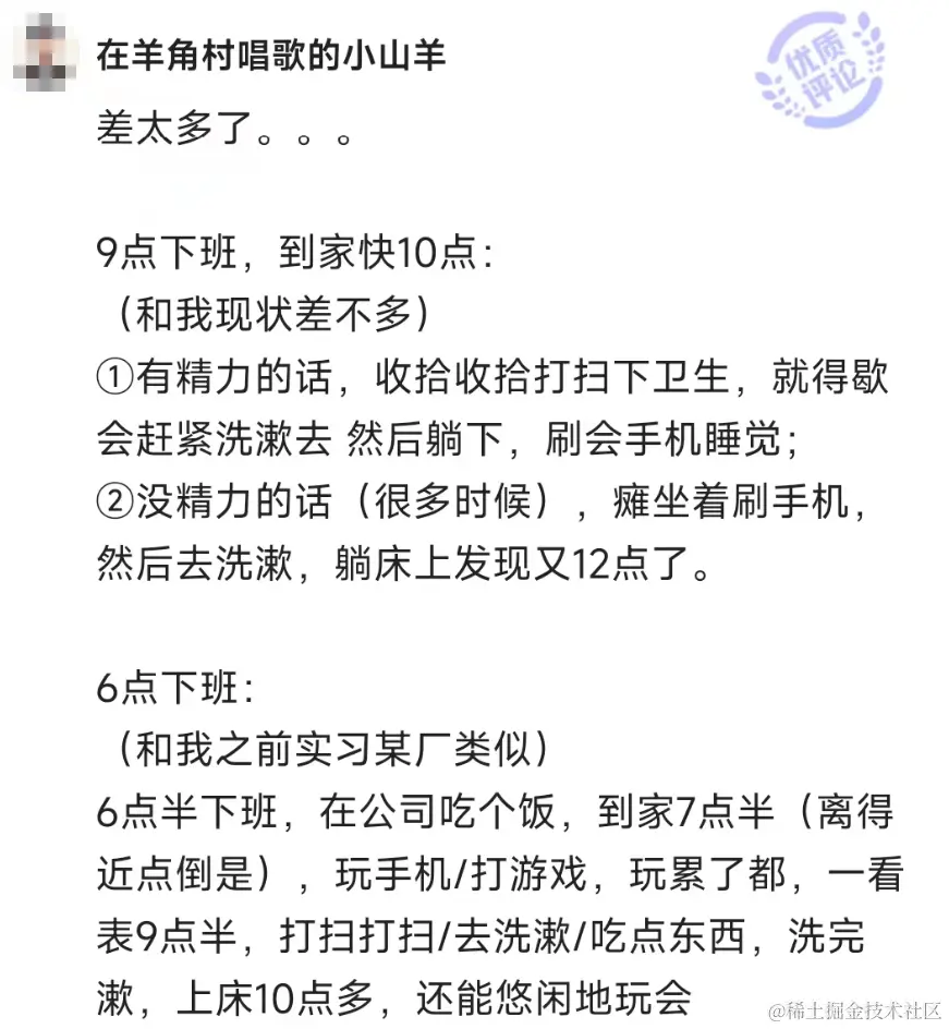 9点下班就像是参加了一场马拉松,回到家只能瘫在沙发上成为刷手机的高手。6点下班就像是赢得了生活的小确幸,还能享受‘晚上还有自己的时间’的奢侈。