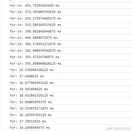 通过上面的方式使用 for 和 for...in 分别遍历计算一个100万数据量的数组,计算其运行的耗时,在 Chrome 120.0.6099.110 浏览器中运行的结果如下