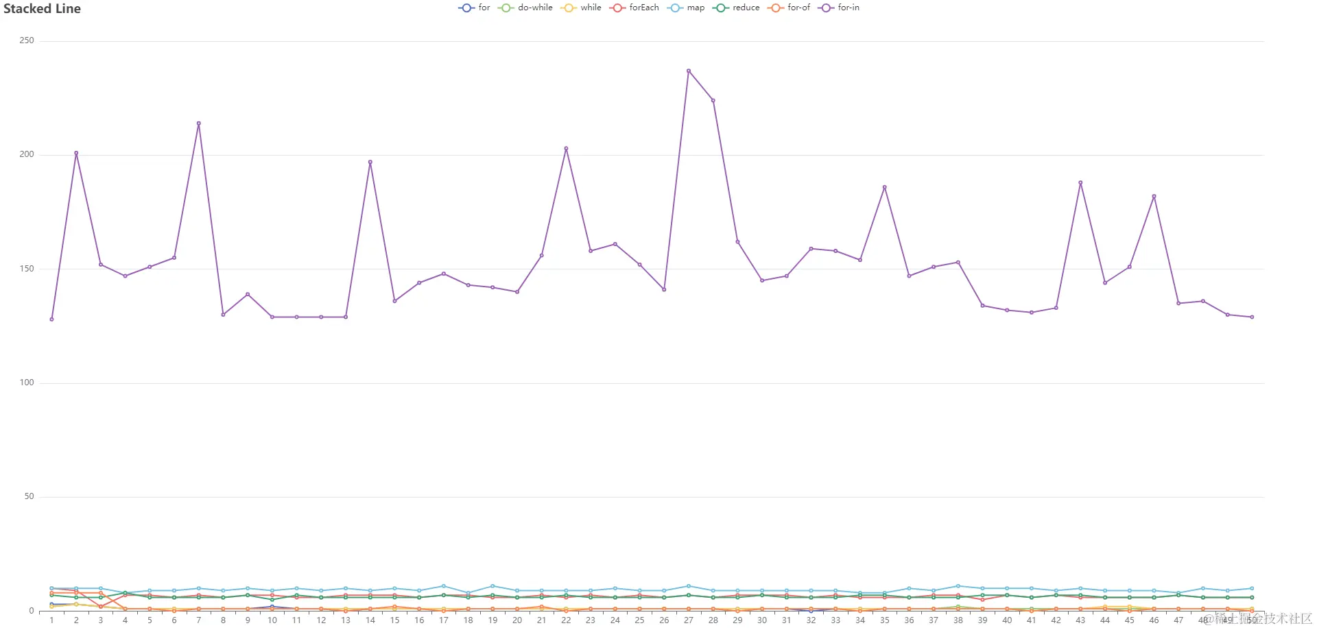 既然是考虑性能,那就将所有的循环方式都进行测试一下,为了更直观一点,将每个循环的测试次数调整为 50 次,生成一个可视化图