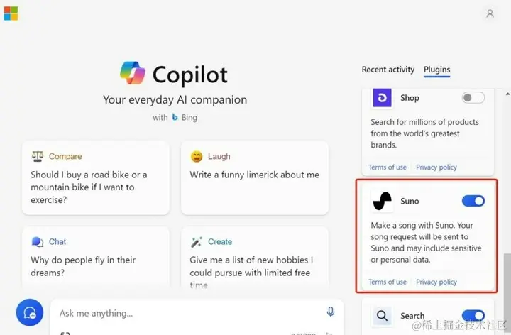 Suno 是一款提供在 Discord 上的 AI 音乐创作工具,可以由单个句子生成完整的歌曲,包括歌词、乐器和歌声。现在 Copilot 用户将能够直接通过插件使用 Suno。
