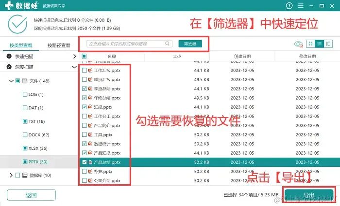 第4步:深度扫描完成后,用户可以系统的对需要恢复的所有文件进行选择,在呈现结果较多的情况下,建议直接在 【筛选器】中对相关数据进行查找和选择,完成所有选择后,点击【导出】 。