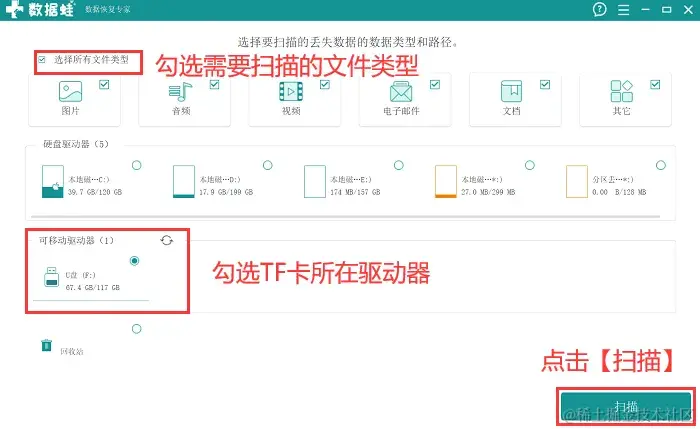 第2步:根据恢复需求,勾选要扫描的文件类型(支持多选和全选),并勾选TF卡所在的驱动器,点击 【扫描】 ;