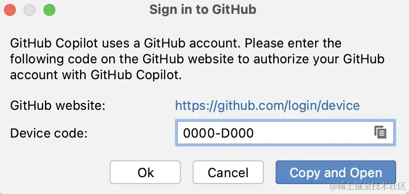 - 在“登录 GitHub”对话框中,若要复制设备代码并打开设备激活窗口,请单击“复制并打开”。