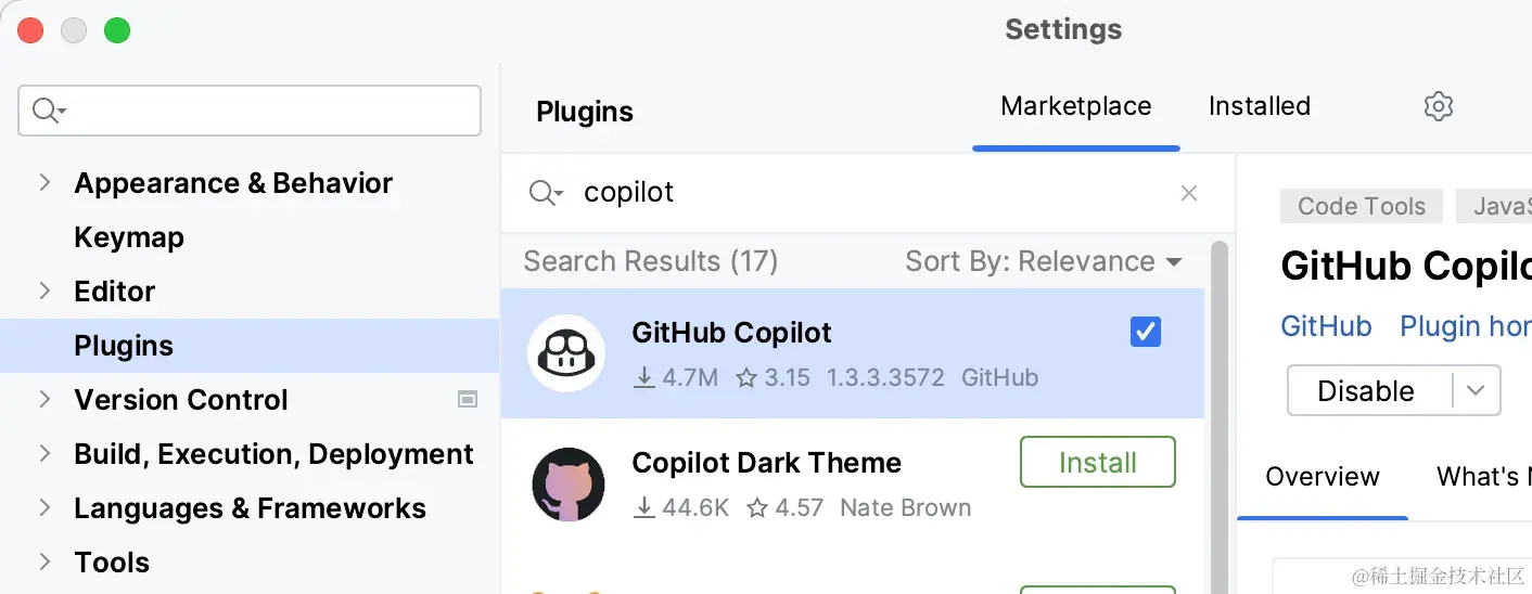 要在 JetBrains IDE 中使用 GitHub Copilot,必须安装 GitHub Copilot 扩展。以下过程将指导您在 IntelliJ IDEA 中安装 GitHub Copilot 插件。在另一个受支持的 IDE 中安装插件的步骤可能有所不同。