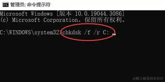 第一步:右键点击 “开始菜单” ,选择“命令提示符(管理员) ”。输入命令 chkdsk /f /r C: (其中C:为要检测的硬盘盘符),按回车键。