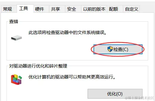 第三步:在 “错误检查” 部分,点击 “检查” 按钮,系统将开始检测硬盘,系统将在检测完成后显示结果,按照提示处理问题。