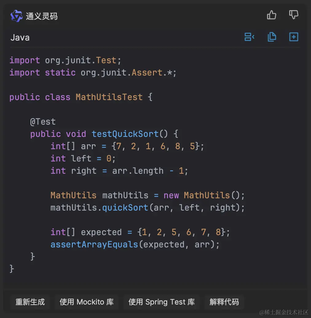 通义灵码的智能问答窗口除了处理基本问答之外,其实还有一些更有意思的功能,比如:解释代码和生成单元测试