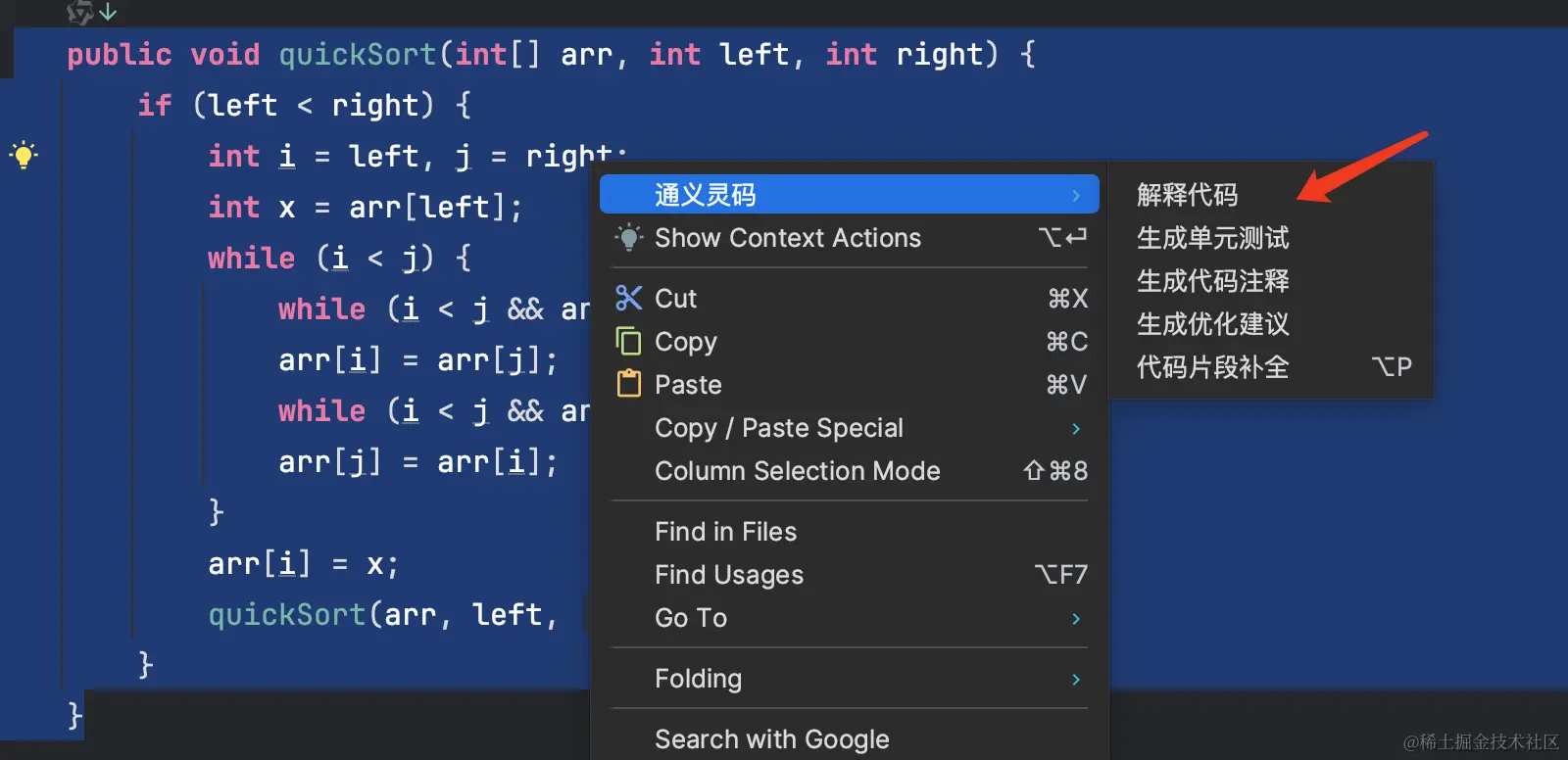 操作很简单,只需要选中上面生成的代码片段,点击鼠标右键,可以看到解释代码和生成单元测试: