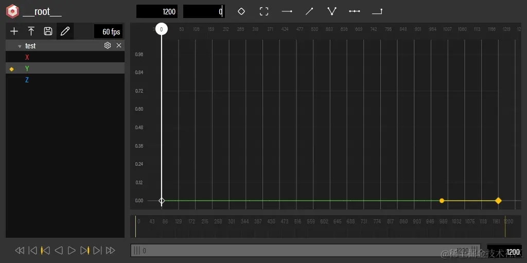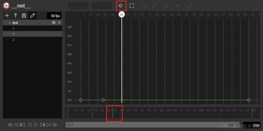 - 创建关键 key:这个按钮将会在整个播放轴上创建一个 新的关键key, 并且将渲染画布此时网格对象的对应属性值作为新创建 key 的属性值,(换句话说,可以在 inspect 页面通过 gizmo 工具拖动旋转物体到指定位置,点击创建 关键 key 按钮就能创建一个新的关键 key , 并将手动拖动的网格对象的属性值作为 该关键 key 的value 值)