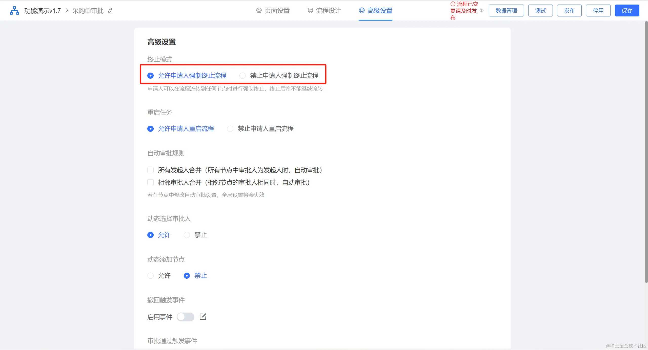 默认情况下,系统会勾选禁止申请人强制终止流程的选项;开启允许申请人强制终止流程,申请人可以在流程流转到任何节点进行强制终止,终止后的流程不再继续流转。
