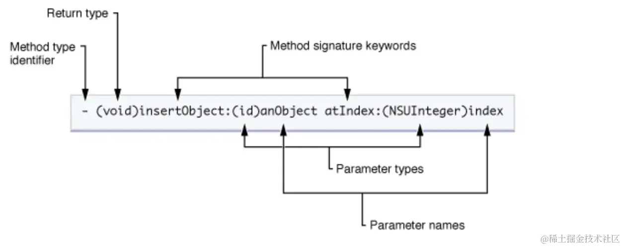 这个方法的签名是setColorToRed:Green:Blue:。每个冒号后面都带着一个float类别的参数