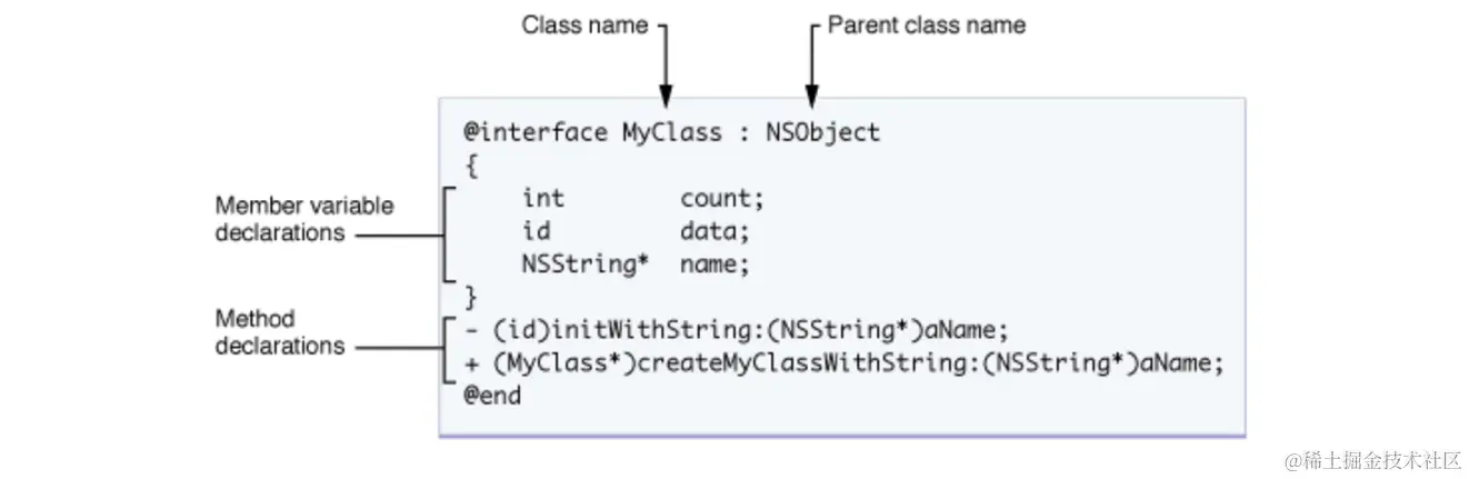 下图展现了声明一个叫做 MyClass 的类的语法,这个类继承自 NSObject 基础类(或称根类)。类声明总是由 @interface 编译选项开始,由 @end 编译选项结束。类名之后的(用冒号分隔的)是父类的名字。类的实例(或者成员)变量声明在被大括号包含的代码块中。实例变量块后面就是类声明的方法的列表。每个实例变量和方法声明都以分号结尾。