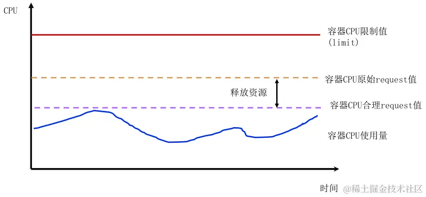 request值接近业务实际使用量,例如用户申请request为2核,limit为4核,实际真实使用量最多1核,那么合理request值设置为1核附近。但是业务真实使用量只有运行一段时间后才能评估,属于后验知识。
