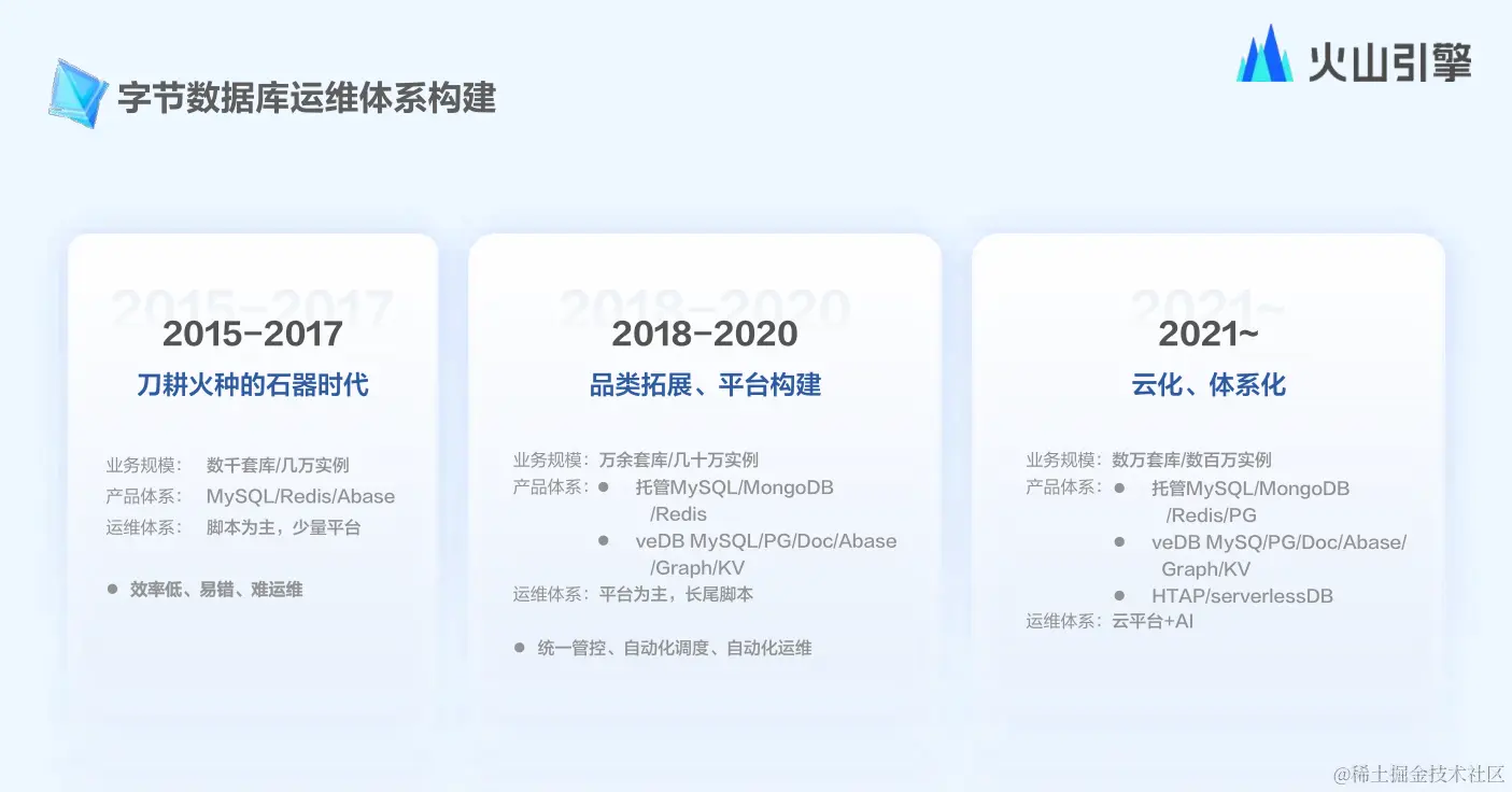 在2017年,集团数据库的数据量只有2000个集群,且每个集群的规模通常为几十万的体量;到2019年,数据量达到了200+PB;直到今天,数据量已经发展到2EB,峰值吞吐量达到了20B+。面对如此庞大的量级,火山引擎始终在思考数据库技术演进之道,大致可分为三个阶段。