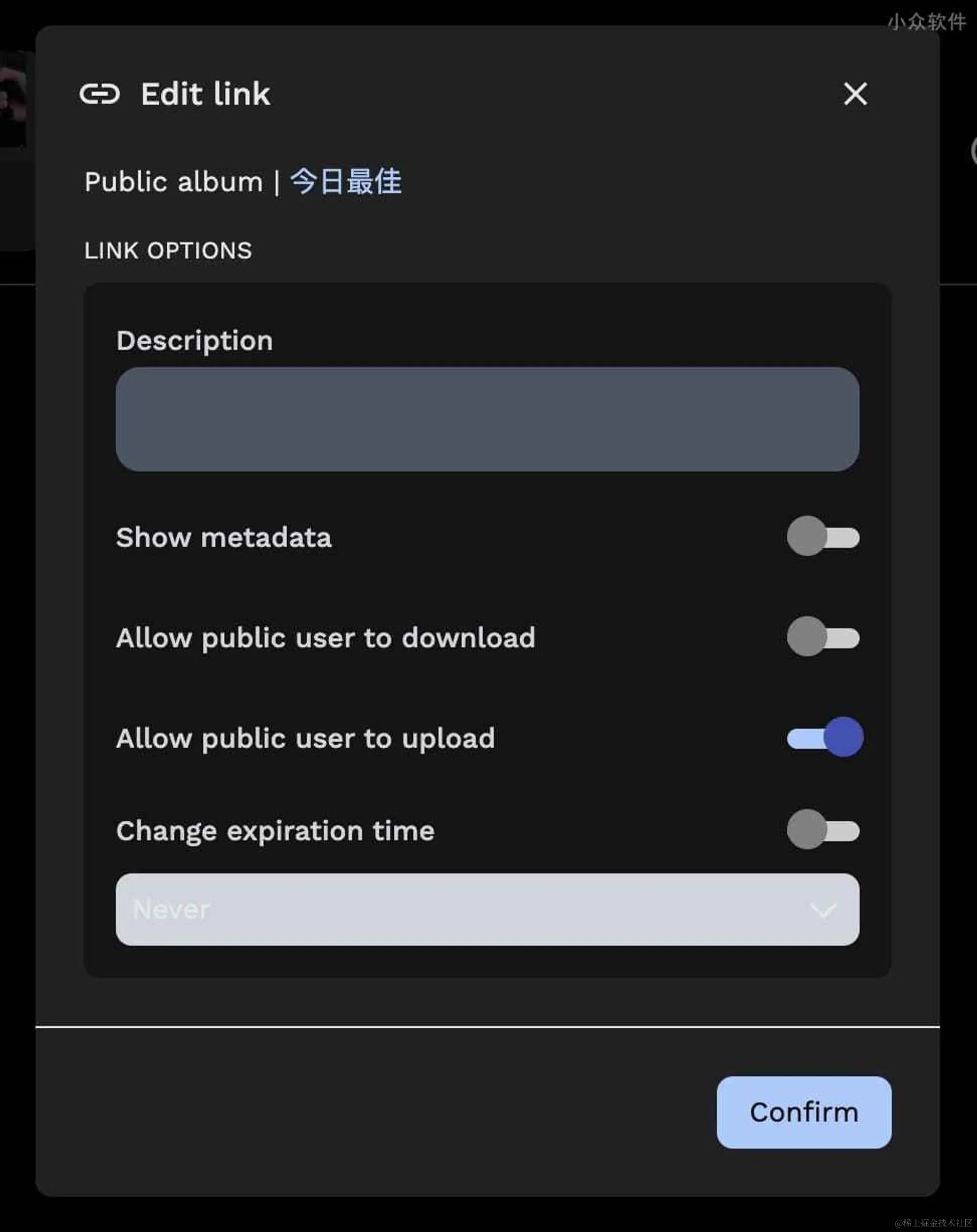分享与上传就很赞了,你可以通过 Immich 将某个相册分享给好友,可以设置很多权限。