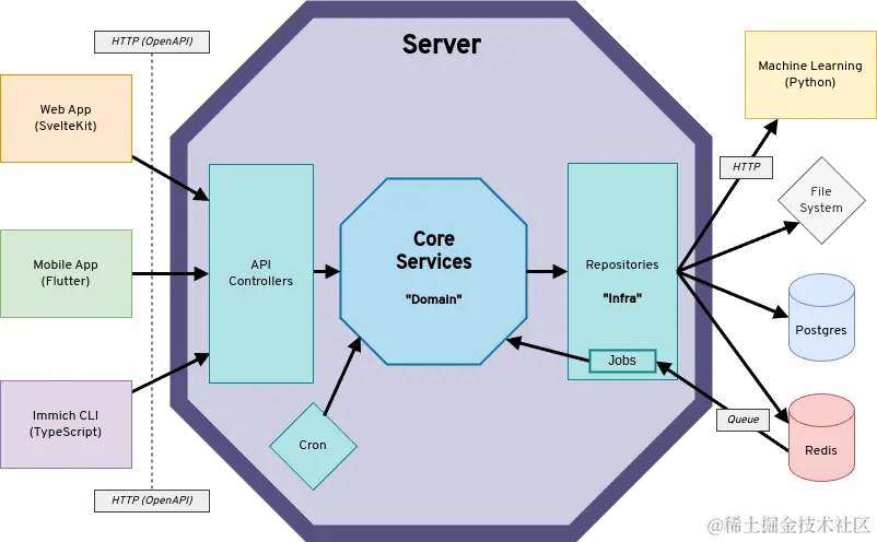 Immich 采用传统的客户端-服务器设计,并配有专用数据库用于数据持久化。 前端客户端使用 REST API 通过 HTTP 与后端服务进行通信。 下面是架构图。