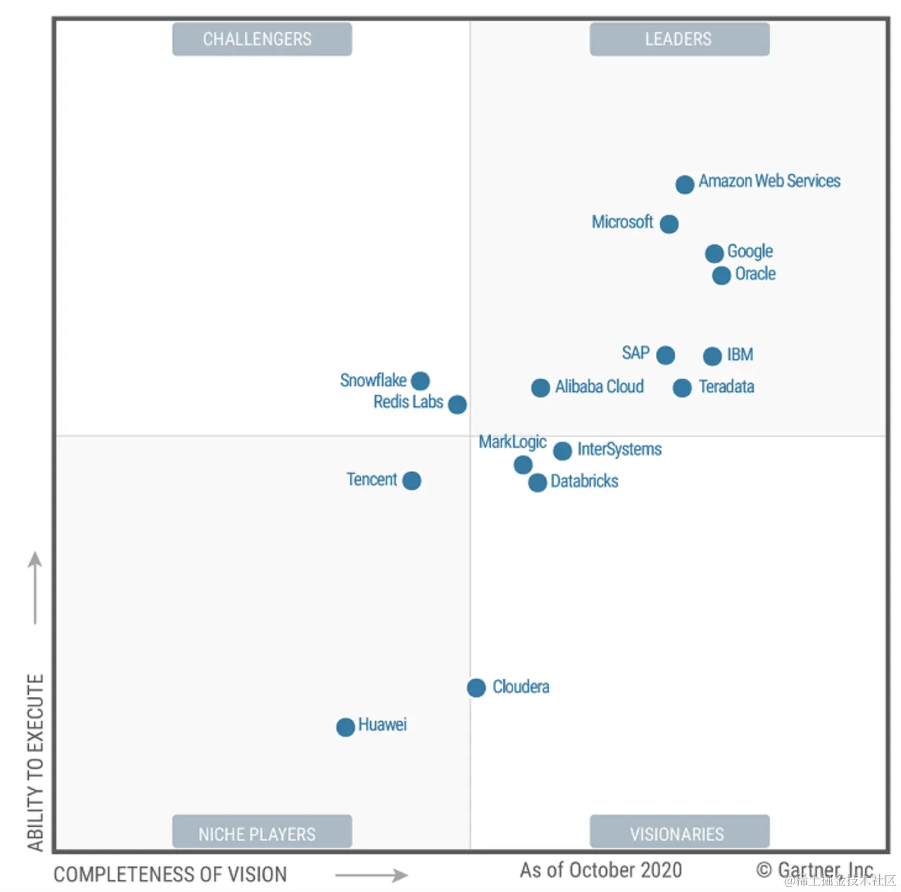 以 2017 年 Gartner 魔力象限定义的数据库市场为例:
