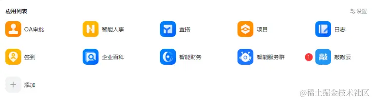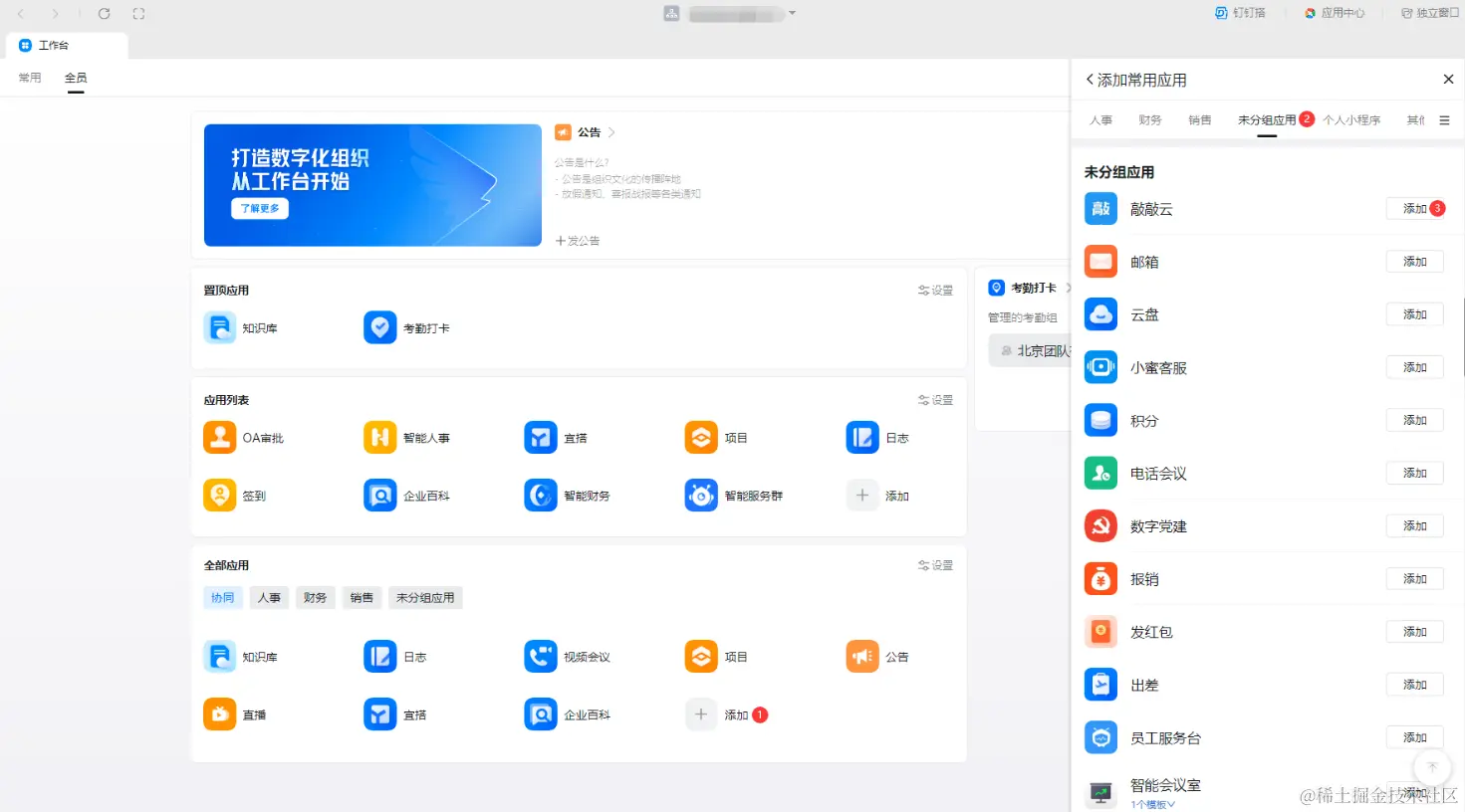 如果在钉钉中找不到敲敲云应用,可在全部应用中点击添加,点击“未分组应用”,找到敲敲云添加即可