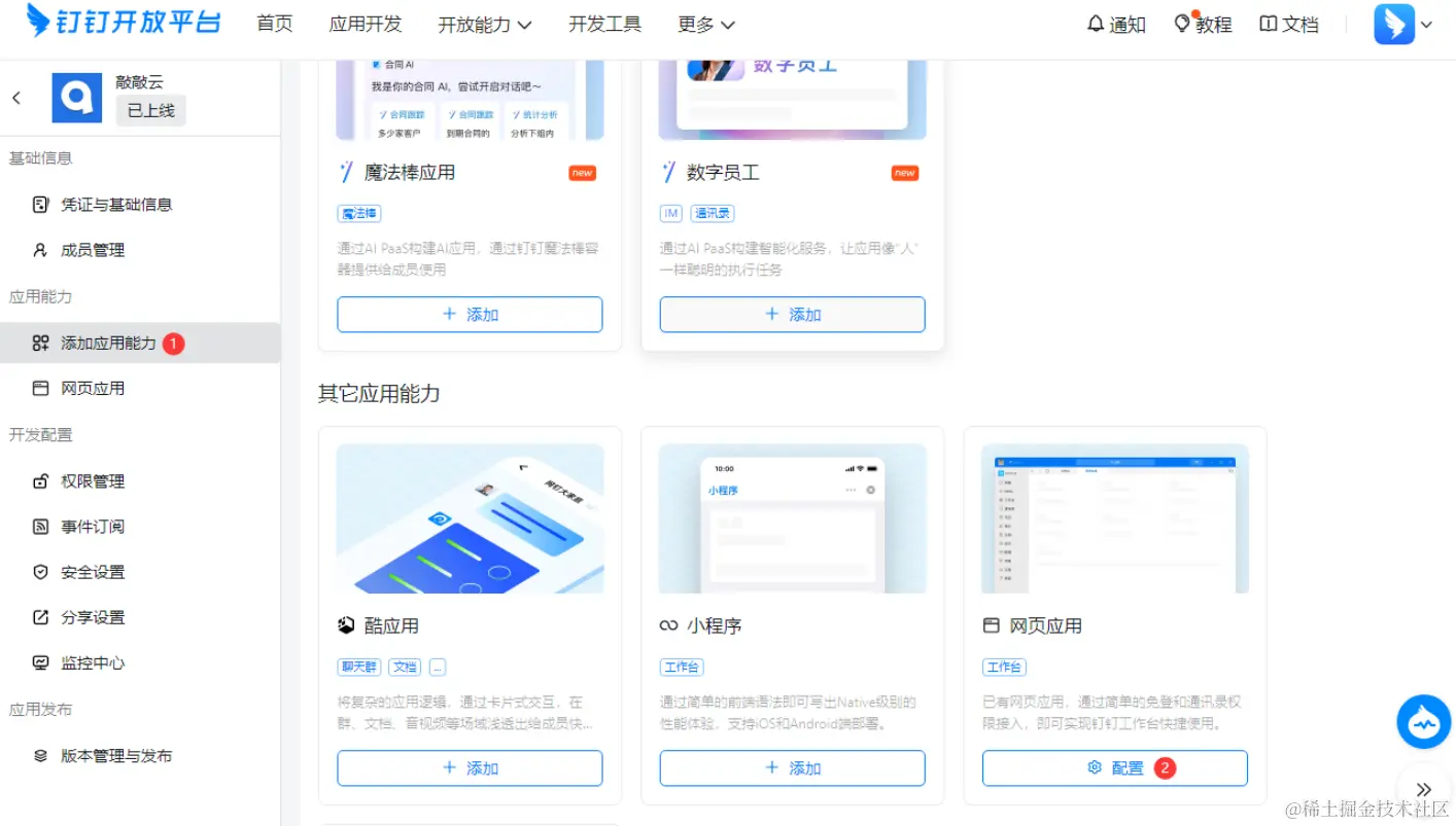 - 在凭证与基础信息中,找到钉钉配置AgentId、AppKey、AppSecret