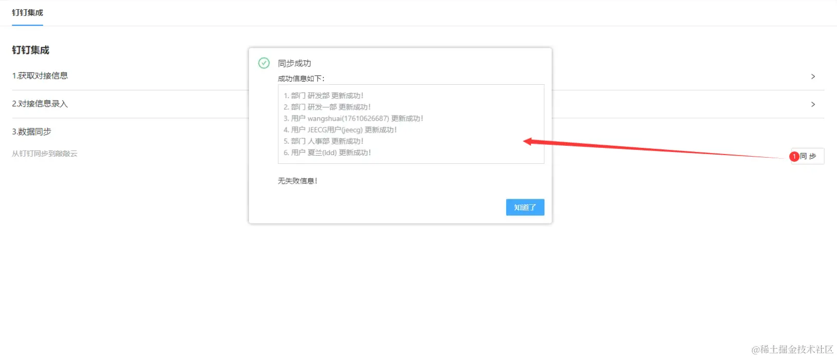 钉钉配置完成后,将钉钉的用户与部门同步至敲敲云中。