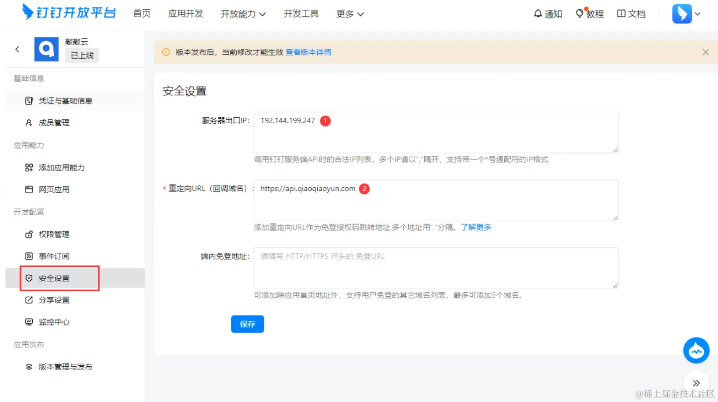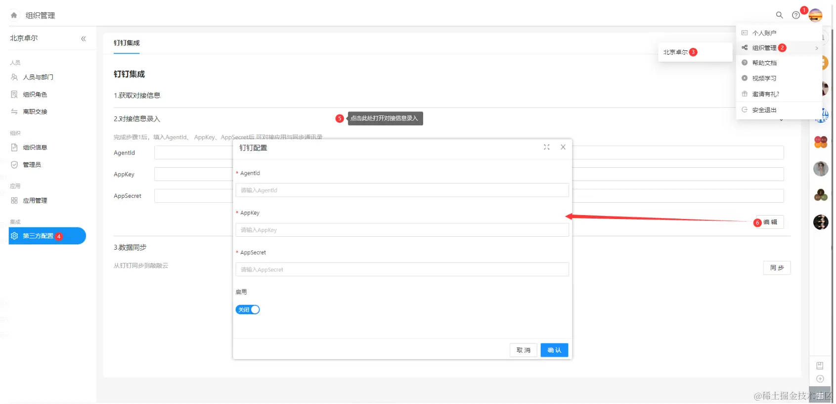 将AgentId、AppKey、AppSecret分别录入敲敲云钉钉第三方配置中
