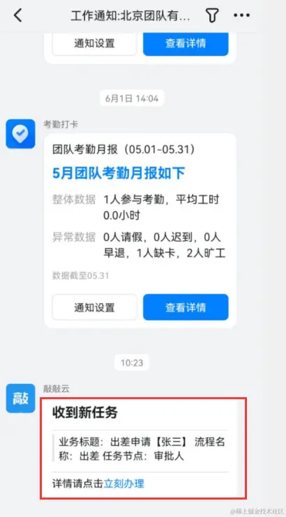流程审批节点开启钉钉消息通知后,会在钉钉中收到新消息提醒