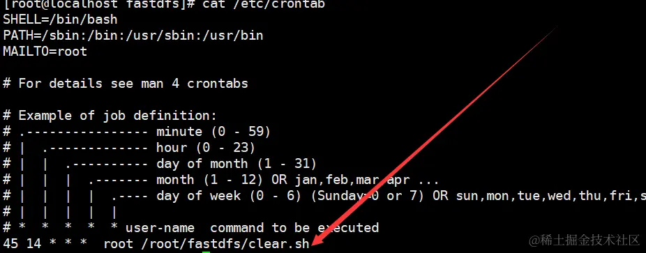 在最后加入:45 14 * * * root /root/fastdfs/clear.sh