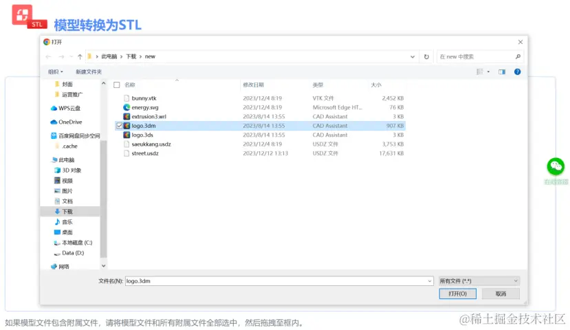 3DM转STL网站也支持通过拖拽的方式,将文件进行上传。在资源管理器中,选择一份或多份模型相关文件,拖拽至3DM转STL网站中的文件接收区域,即可完成3D模型文件的上传。