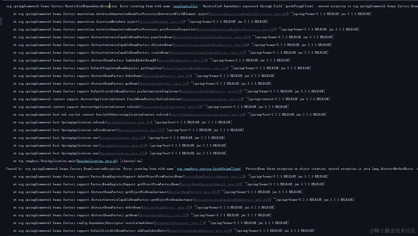 org.springframework.beans.factory.UnsatisfiedDependencyException: Error creating bean with name 'userController': Unsatisfied dependency expressed through field 'goodsFeignClient'; nested exception is org.springframework.beans.factory.BeanCreationException: Error creating bean with name 'top.yangbuyi.service.GoodsFeignClient': FactoryBean threw exception on object creation; nested exception is java.lang.AbstractMethodError: com.alibaba.cloud.sentinel.feign.SentinelContractHolder.parseAndValidateMetadata(Ljava/lang/Class;)Ljava/util/List;
