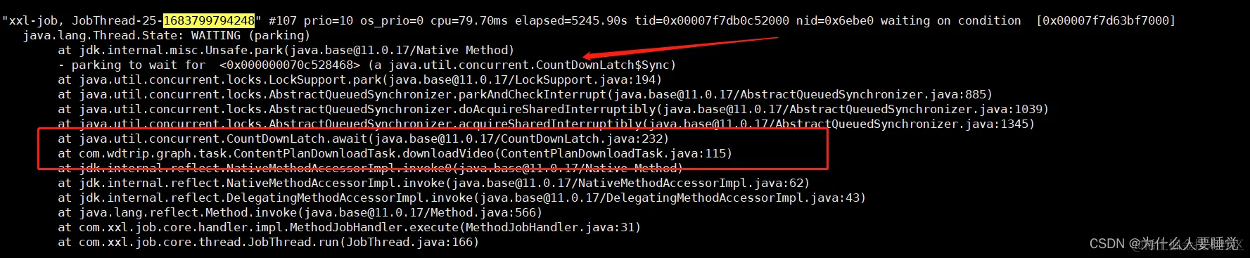 再通过jstack -l $pid 查看线程日志,看一下这条线程现在在干嘛,这里可以看到我们的业务代码,线程具体阻塞再哪一行代码,还有阻塞的原因,明显是CountDownLatch这个并发工具搞的鬼。