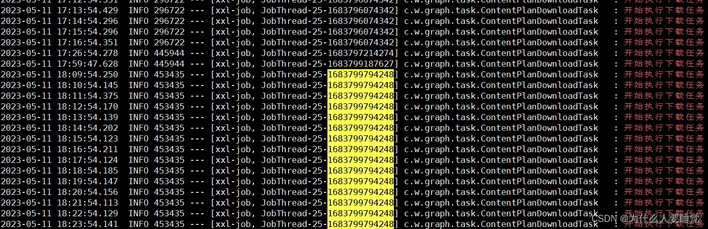 开始问题分析,先看日志是那条job日志被阻塞,发现最后一条任务执行的日志线程id为:JobThread-25-1683799794248