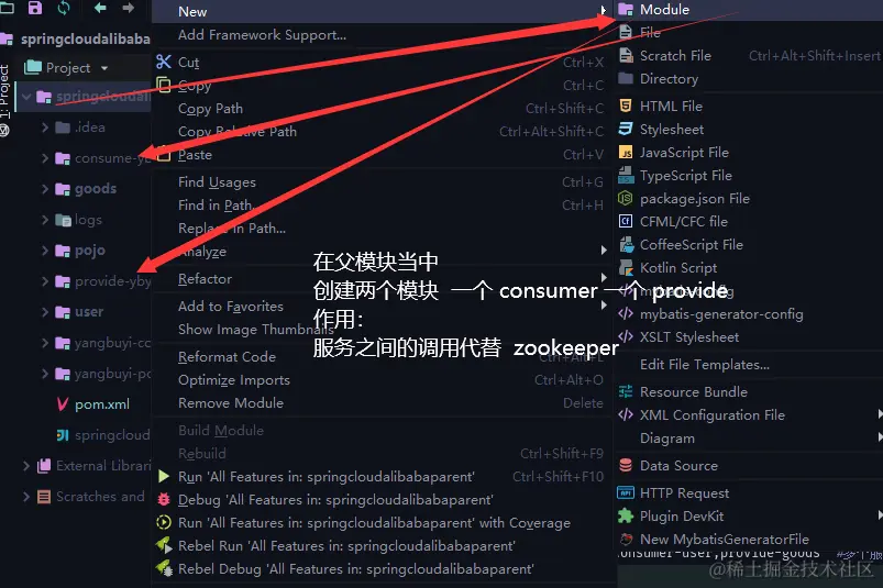 创建consumer工程模块和provide工程模块(调用者、服务者)