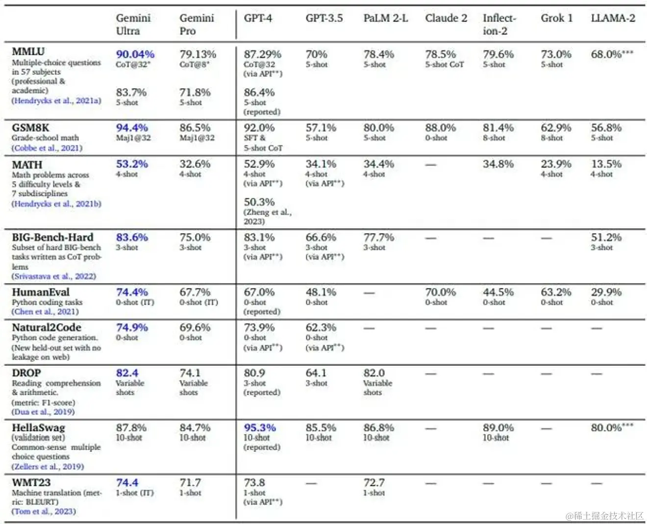 Gemini Ultra的90%得分是基于谷歌研究人员开发的一种基于32个样本思维链的方法。对于同一个问题,Gemini Ultra会生成32个答案以及这些答案的推理。然后,模型会选择最常见的答案作为最终答案。