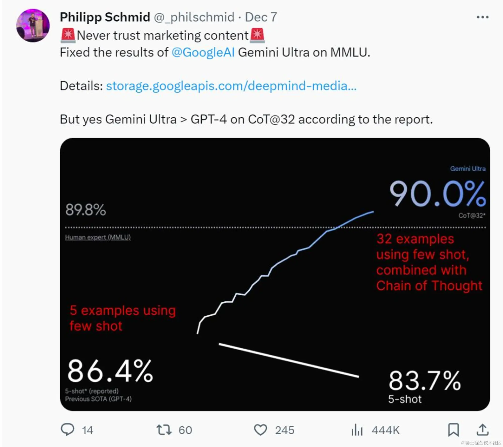 但GPT-4的86.4%分数是基于行业评估标准5-shot。HuggingFace技术主管Philipp Schmid特意从Gemini的技术报告中提取数据重做计算,在5-shot的标准下,Gemini的得分实为83.7%,比GPT-4更低。