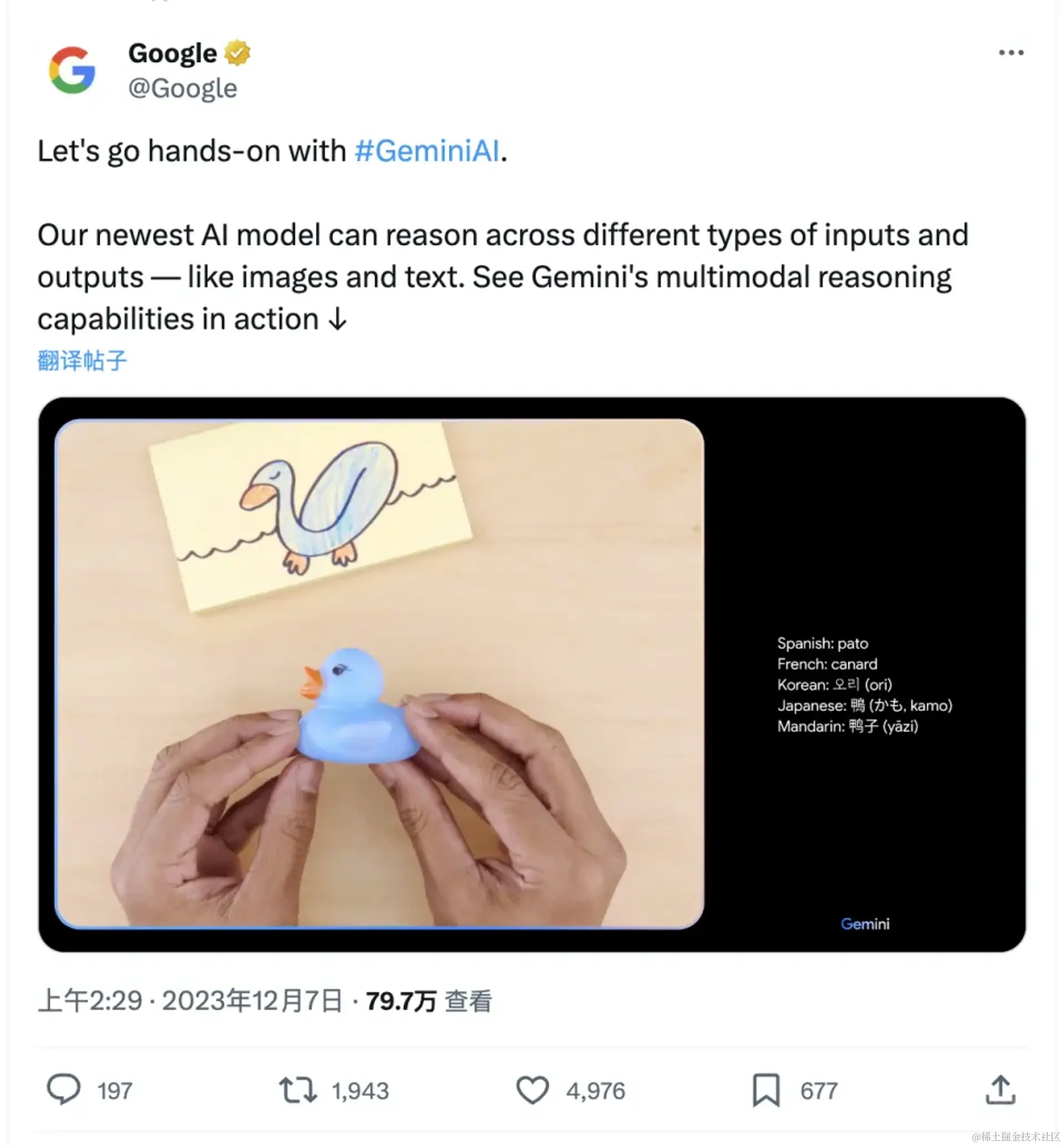 与此同时,一段大约6分钟的Gemini演示视频,也在各个自媒体平台疯传。最个视频展示在在视频下的人工智能,不仅能听会说,还是能看得清、看得懂,丝滑的交互,让我们感觉离AGI又进了一步。