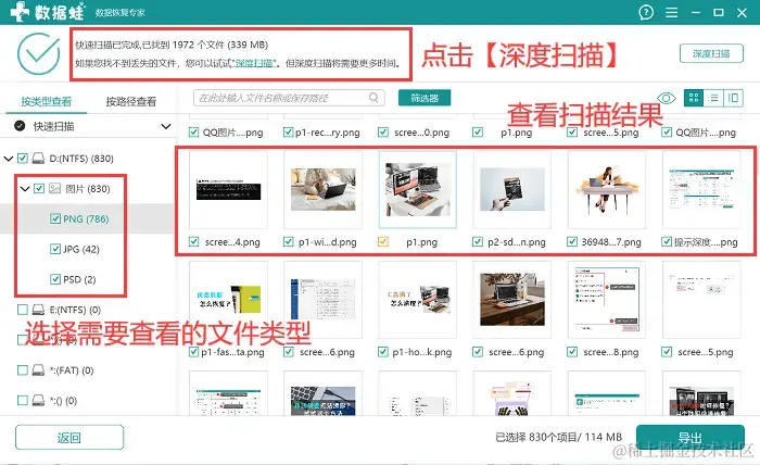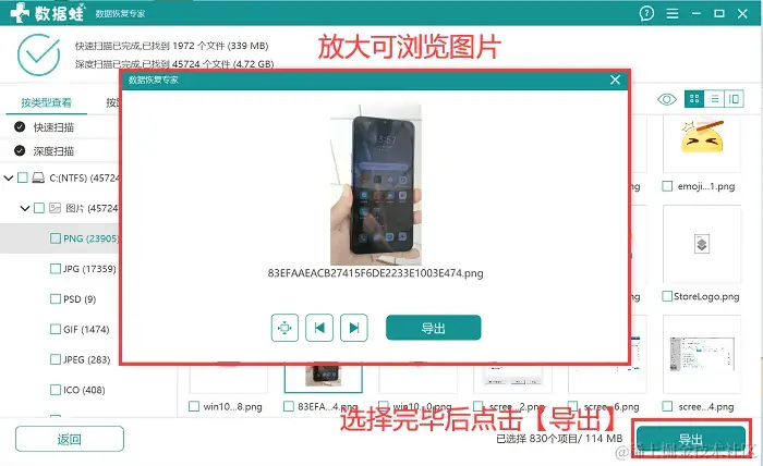 步骤4:深度扫描完成后,用户可以对所有扫描到的文件进行查看和选择,在文件过多的情况下,建议直接在 【筛选器】 中对文件进行定位和选择,图片还支持放大查看,操作完毕后,点击【导出】。