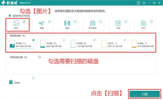 步骤2:在选择界面,需要恢复照片的用户可以直接勾选上 【图片】,并选择图片删除前所在的磁盘,点击【扫描】 ;