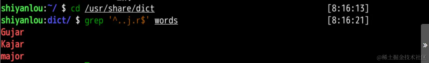 - 利用 Linux 系统自带的字典查找一个五个字母的单词,第三个字母为 j,最后一个字母为 r