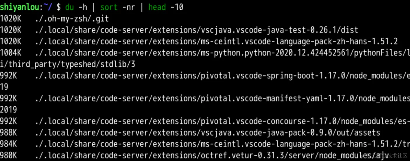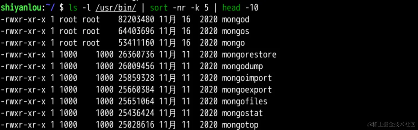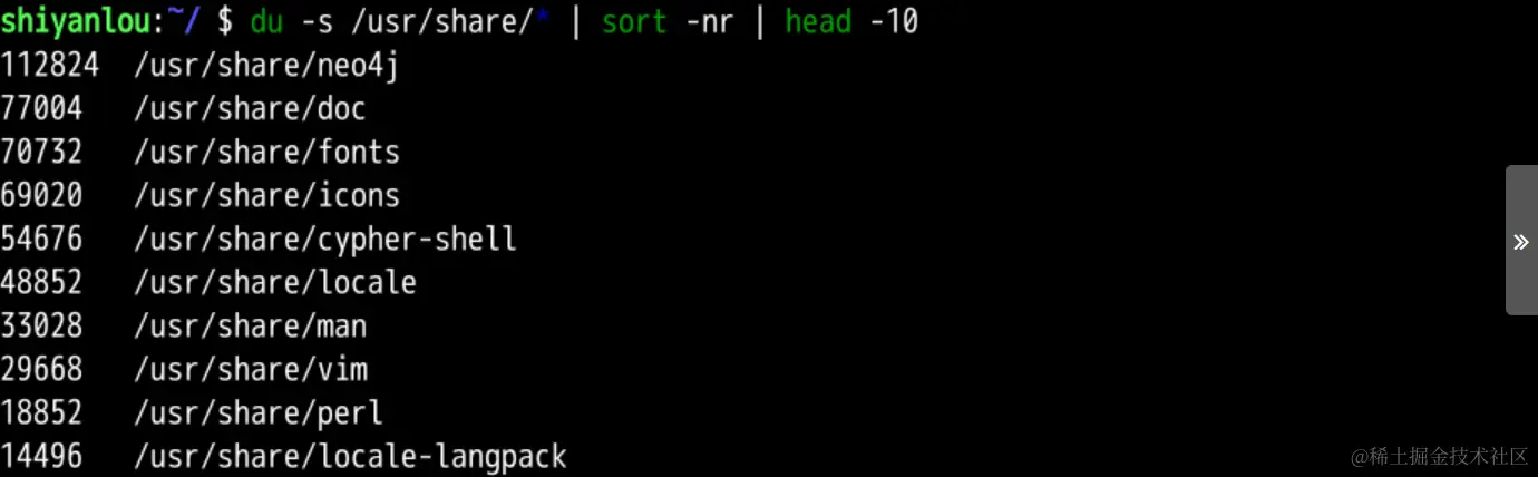 /usr/share/目录下使用空间最多的前 10 个目录文件du -s /usr/share/*命令显示/usr/share/目录下所有文件和目录的磁盘使用空间- -nr:字符串长度排序 反顺序