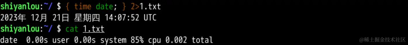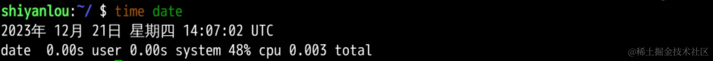 时间(real time)、用户态使用时间(the process spent in user mode)、内核态使用时间(the process spent in kernel mode)。 - 测量 date 命令运行的时间