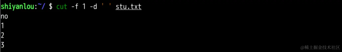 - -d ' ' 分割符为空格,-f 自定义字段,第一行和第三行